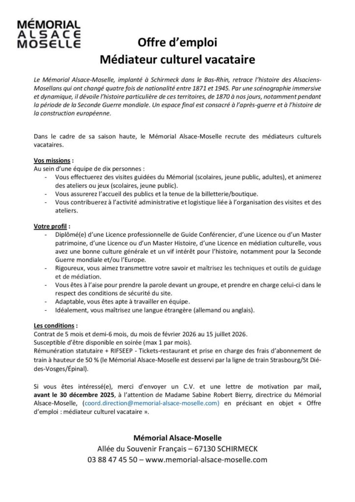 Offre d’emploi de médiateur culturel vacataire au Mémorial Alsace-Moselle.