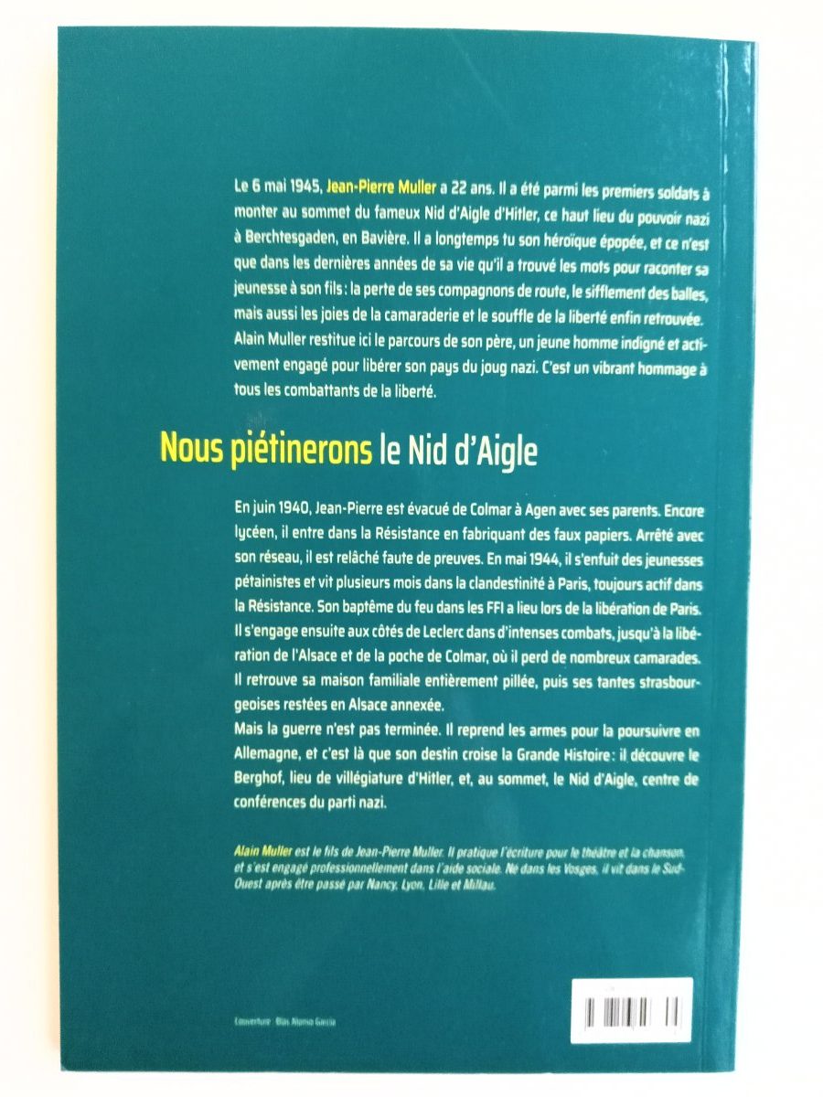 Le 6 mai 1945, Jean-Pierre Muller a 22 ans. Il a été parmi les premiers soldats à monter au sommet du fameux Nid d’Aigle d’Hitler, ce haut lieu de pouvoir nazi à Berchtesgaden, en Bavière. Il a longtemps tu son héroïque épopée. Ce n’est que dans les dernières années de sa vie qu’il a trouvé les mots pour raconter sa jeunesse à son fils : la perte de ses compagnons de route, le sifflement des balles, mais aussi les joies de la camaraderie et le souffle de la liberté enfin retrouvée. Alain Muller restitue ici le parcours de son père, un jeune homme indigné et activement engagé pour libérer son pays du joug nazi. C’est un vibrant hommage à tous les combattants de la liberté.