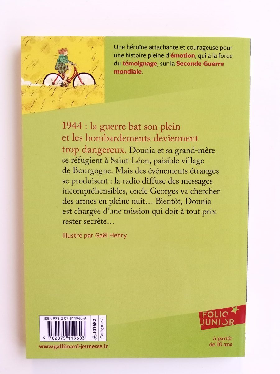 1944 : la guerre bat son plein et les bombardements deviennent trop dangereux. Dounia et sa grand-mère se réfugient à Saint-Léon, paisible village de Bourgogne. Mais des événements étranges se produisent : la radio diffuse des messages incompréhensibles, oncle Georges va chercher des armes en pleine nuit… Bientôt, Dounia est chargée d’une mission qui doit à tout prix rester secrète….